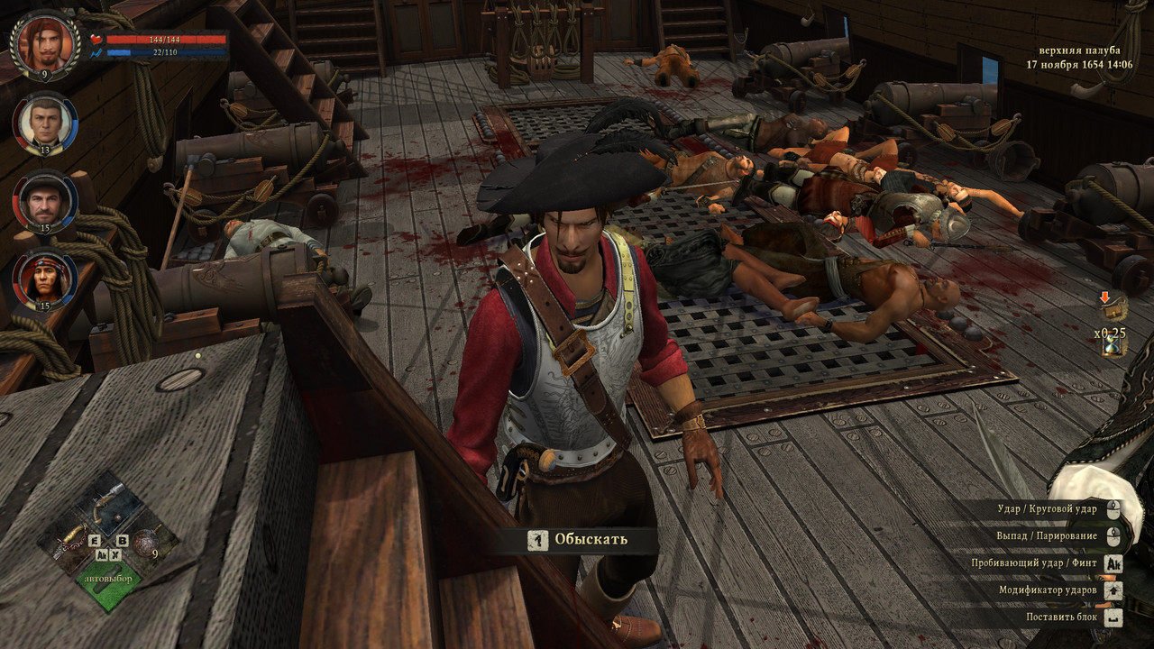 Спойлер: Шарль-Атлет 9 левела пошел на это первый раз не на фрегате, не на корвете, а на каравелле со 160 человек экипажа. Спойлер: У него был только один козырь, один мотив. Не тинктура, рецепт которой требует сундука алхимика или перка Алхимии. Не многозарядный огнестрел или склопетта - Шарль еще не отыскал ни один клад 2-го уровня. А только спасение еще не бессмертного Клода Дюрана. Любой ценой. Тичингиту и Томми уже бессмертны. И они оживут после любого абордажа. А этот нет. Только он поможет победить на нижней палубе - если он останется жив на верхней. Без устали нанося круговые удары клевангом, с амулетом "Упырь", де Мор защищал своего абордажника сначала от двоих, потом от четверых, а потом и все восемь индейцев, негров и белых (некоторые - в испанских доспехах) столпились вокруг двух друзей. Здесь я вспомнил фразу Собатини из "Хроник капитана Блада": "...большинство {пиратов} предпочитало драться голыми по пояс...". Действительно в эту 50-тую попытку абордажа Мементо большинство из его экипажа дралось именно так. На место каждого сраженного врага тут же подбегал другой. Каждый раз, когда был убит индеец - всплывал лог ухудшения с ними отношений ![]() Шарль уже не помнил, какие лечилки он пил, потратив все 3 припасенные лечебные микстуры... Наверное - весь алкоголь подряд - вперемешку с какими-то непонятными эликсирами. Но верный маског Тичингиту, стоя на возвышении носа каравеллы, показывал класс стрельбы из простого фитильного мушкета. Он добил своего коллегу-мушкетера с пиратского брига, ранившего Томми, который лежал на палубе без сознания. Затем - одного из голых по пояс пиратов. И одновременно, заряжая мушкет, ухитрялся отмахиваться им же от негра в шляпе, похожей на Леприконовскую. Положив всю разношерстную толпу, два друга оглянулись на своего товарища-индейца. А тот как раз в этот момент ошеломив своего противника прикладом мушкета, приложил его к плечу... На второй палубе удалось спасти только одного моряка из экипажа каравеллы. Худой матрос, шатаясь от нанесенных ему ран, не мог понять, как он остался жив после разрыва гранаты, которую пьяный Шарль наобум выпалил из странной маленькой мортирки, подаренной еще более странным человеком из пирамиды инков. А был ли это человек? Уже выпивший смертельную для обычного человека дозу спиртного, молодой капитан распахнул дверь каюты своего непьющего противника. Тщетно тот разряжал все четыре ствола своего пистолета в дворянина, спасшего своего друга. И спасенного верным маскогом. На парадной кирасе пьяного капитана красовались еще два амулета - "черепашка-везунчик" и "щит Нгомбо". Когда Грим устал махать своей огромной саблей, Шарль разрядил свой маленький гранатомет ему в лицо. Четыре корабля из эскадры де Мора с напряжением следили, чем кончится бой с "бессмертным" экипажем Мементо. Но вот на верхней палубе показался Алонсо с вестью от победившего капитана. Он объявил, что Шарль берет себе Мементо флагманом. А это означает, что каравелла после перегрузки с нее всех боеприпасов, рома и оружия сейчас будет затоплена. Испанский город Сантьяго-да-Куба даже не обратил внимания на четырех друзей, сошедших на пристань с бывшего пиратского брига. Только один солдат по привычке спросил: "Кто таков?" и получил ответ, что это обладатель лицензии ГВИК, которая будет действовать еще почти 3 года. Последний ра